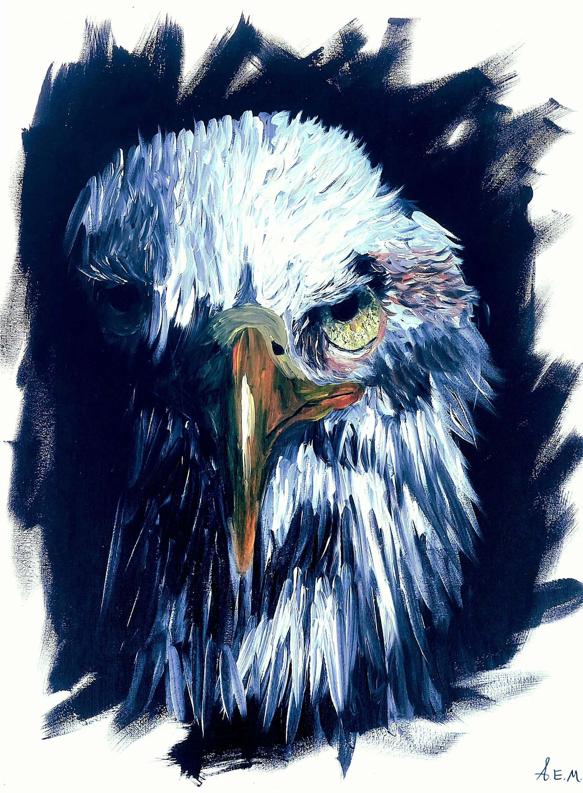 DETERMINATION - De vorm van de adelaar is gedeeltelijk in schaduw gehuld, waardoor zijn scherpe, gefocuste oog met fijne details wordt benadrukt. Het contrast tussen licht en donker geeft diepte aan de indrukwekkende uitstraling van de adelaar, waardoor dit werk een krachtig statement wordt. Acryl op 3D-doek.
