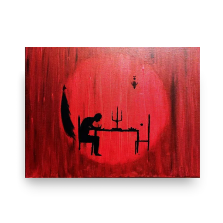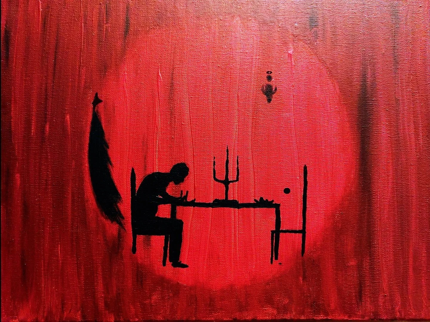 FINAL ACT - Een symbolisch schilderij tegen de achtergrond van een gesloten theatergordijn, verlicht door een eenzame spotlight. Het toont het silhouet van een oudere man die dineert tegenover een lege stoel, waaruit een engel begint op te stijgen. Een poëtische reflectie op herinnering, liefde en afscheid. Acryl op doek.