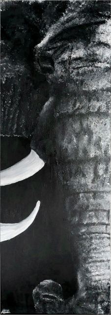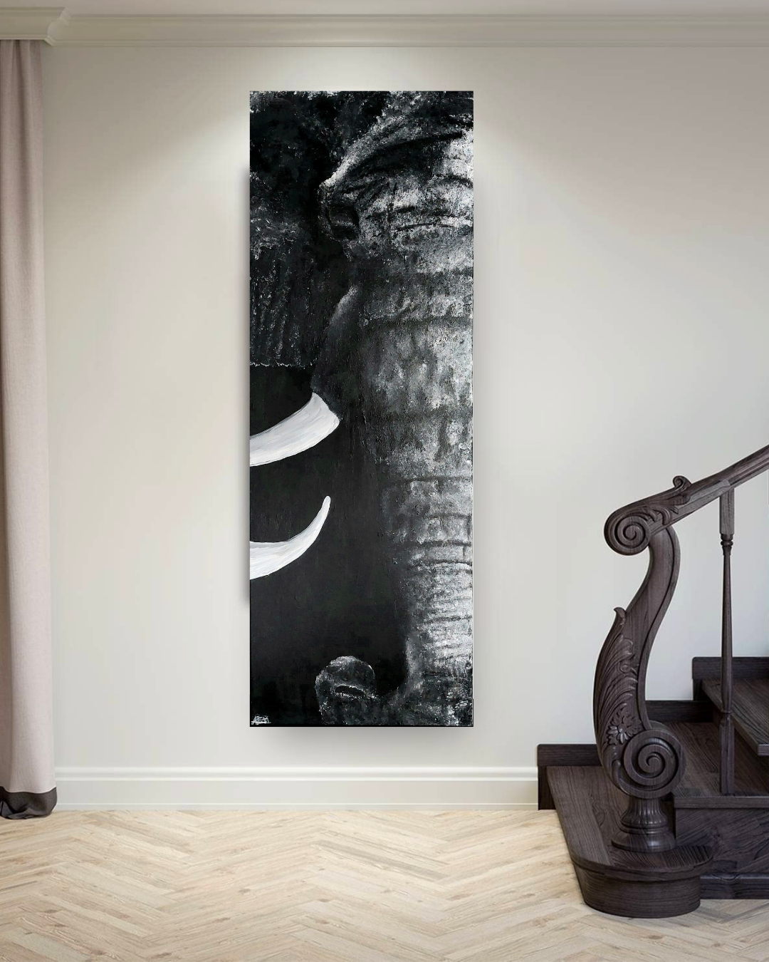 MATRIARCH - Een zwart-wit acrylschilderij van een olifant, dat de kracht, wijsheid en gratie van dit majestueuze dier vastlegt. Bekend om hun sterkte, geheugen en geduld, weerspiegelt dit werk de tijdloze eigenschappen van de olifant op doek.