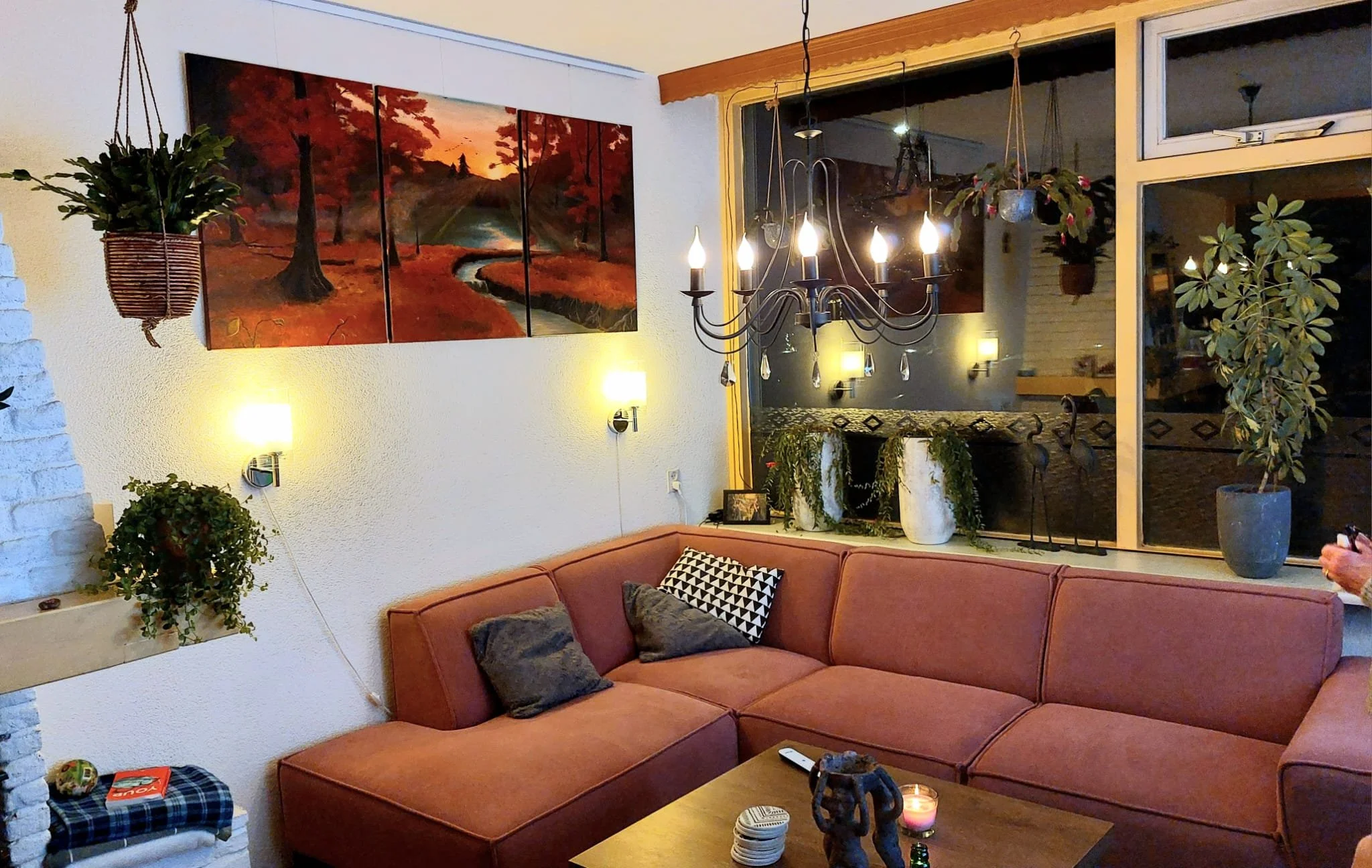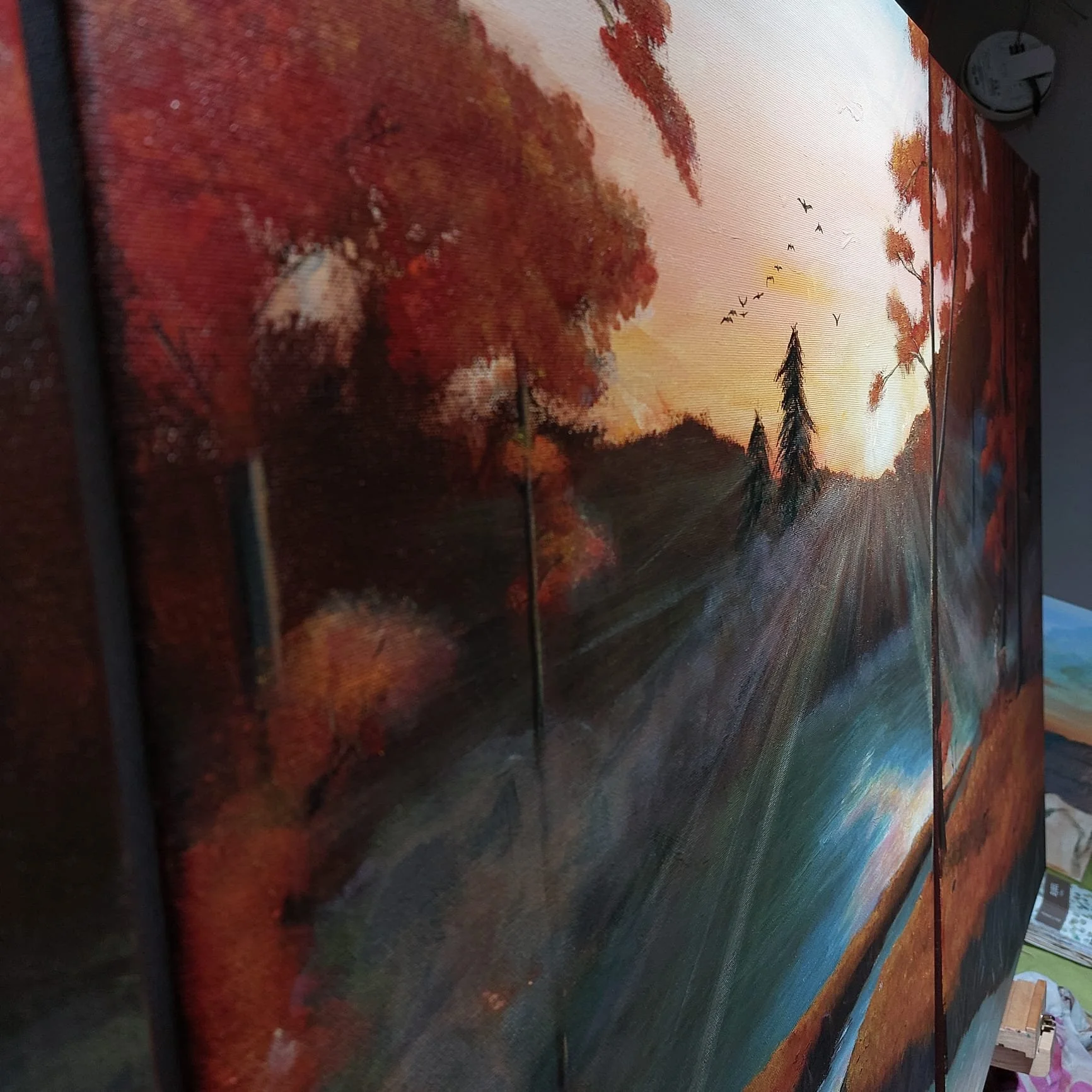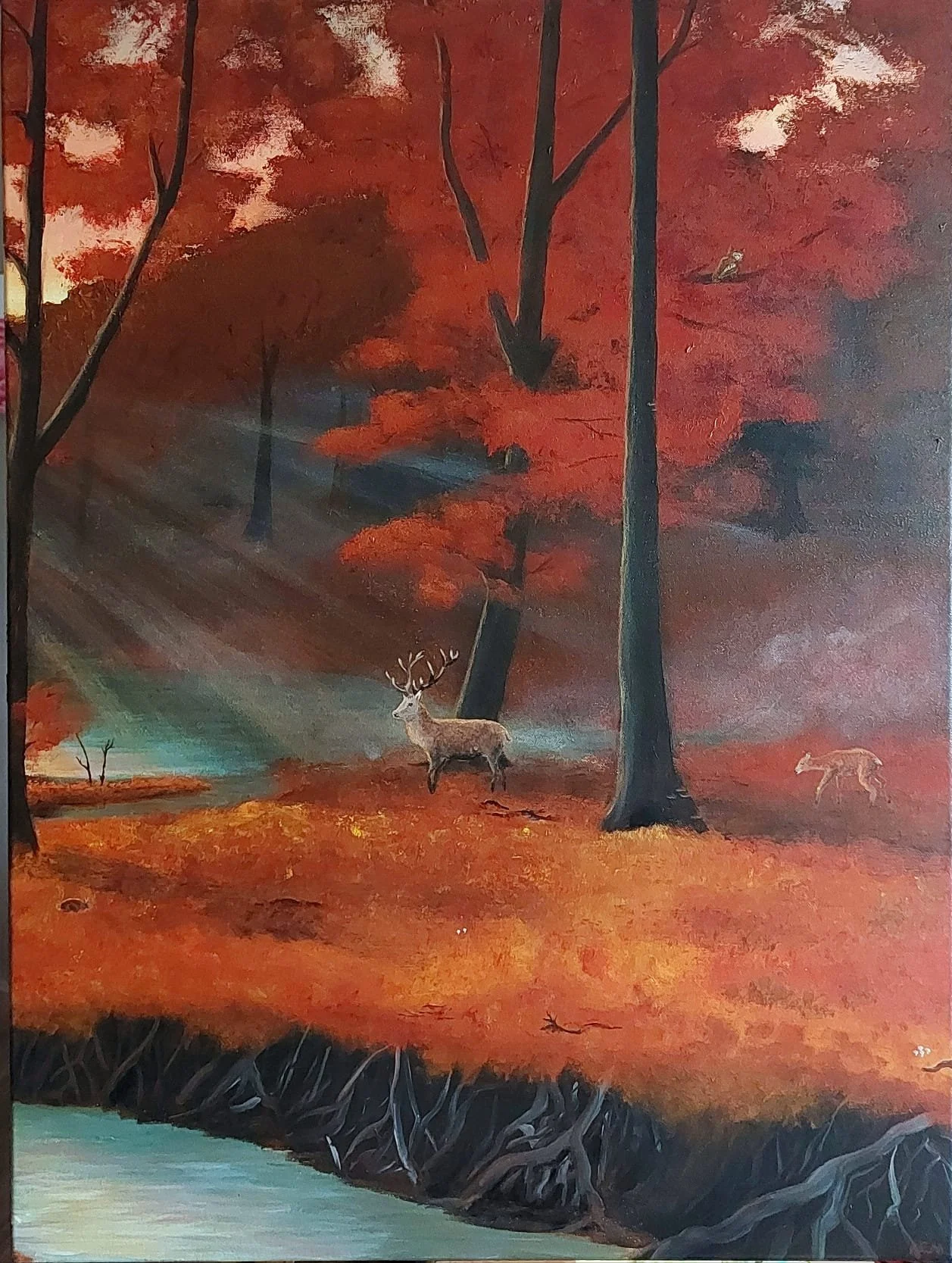 SONITUS SILVAE - Een drieluik passend in het vernieuwde interieur. Overlegd en aangenomen als een wens: boomwortels, een warm bos, uil, watertje in de verte, mist, reeën, haasjes, eekhoorn, vogels en een warme zachte zon: samengekomen op doek. Acryl op canvas, 80x120cm.