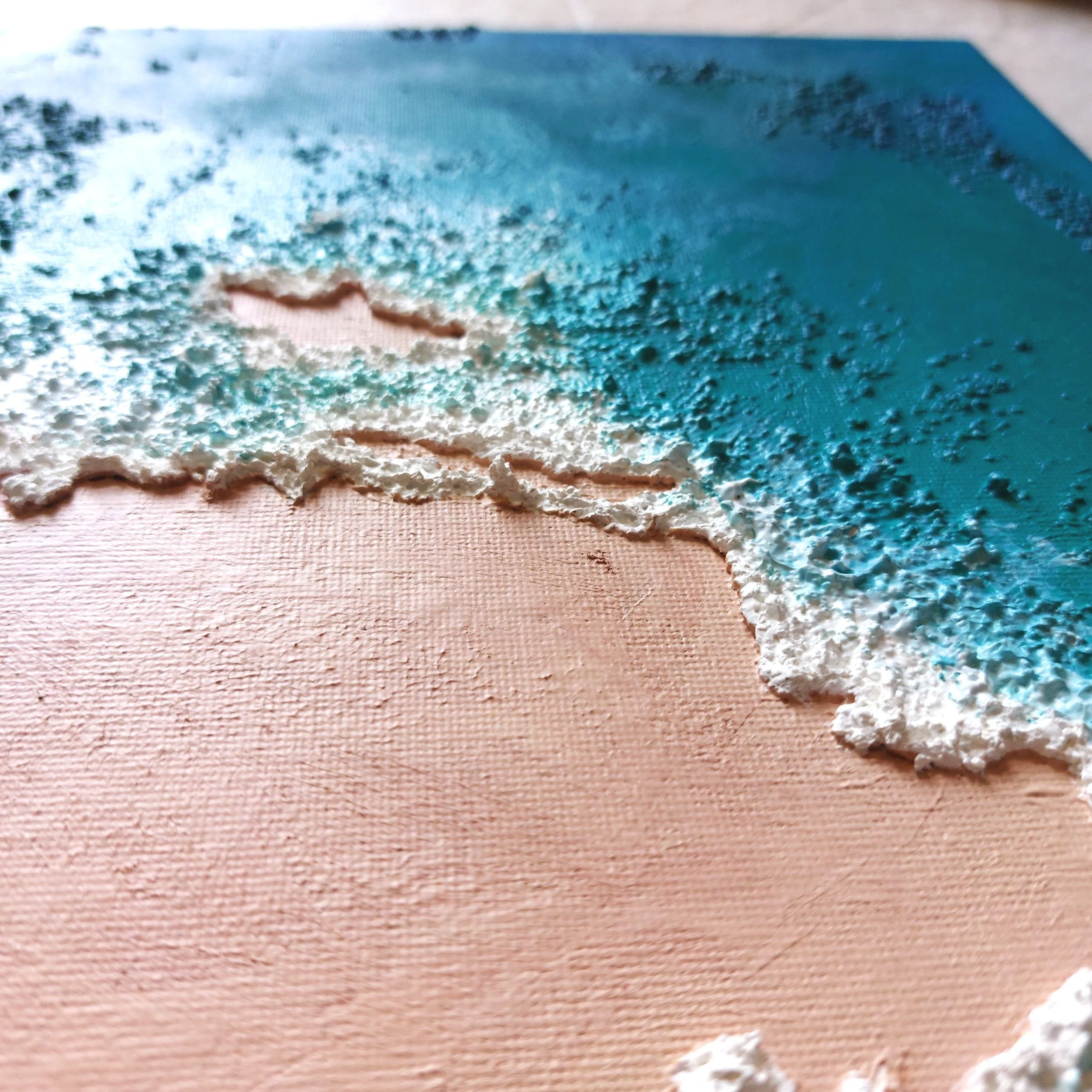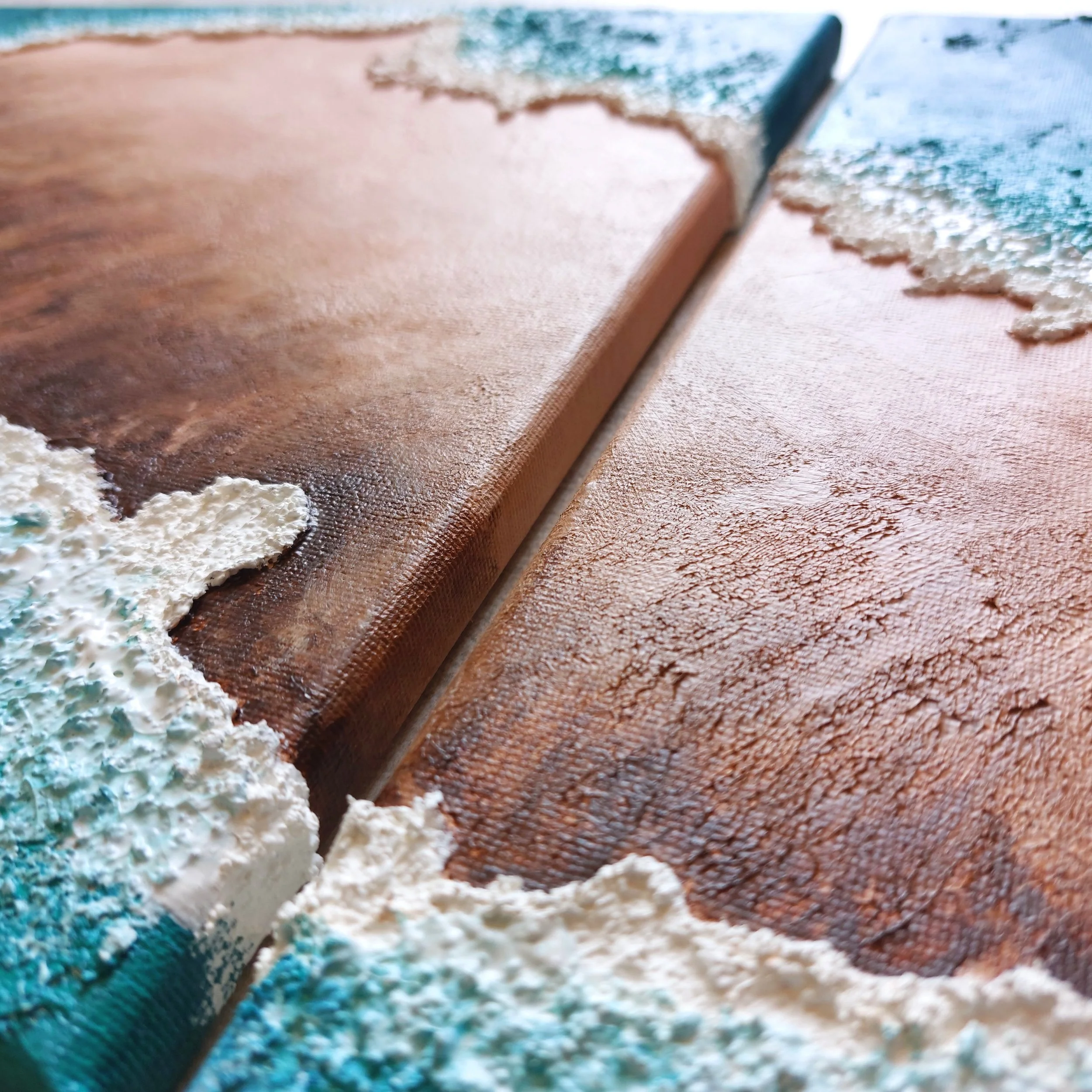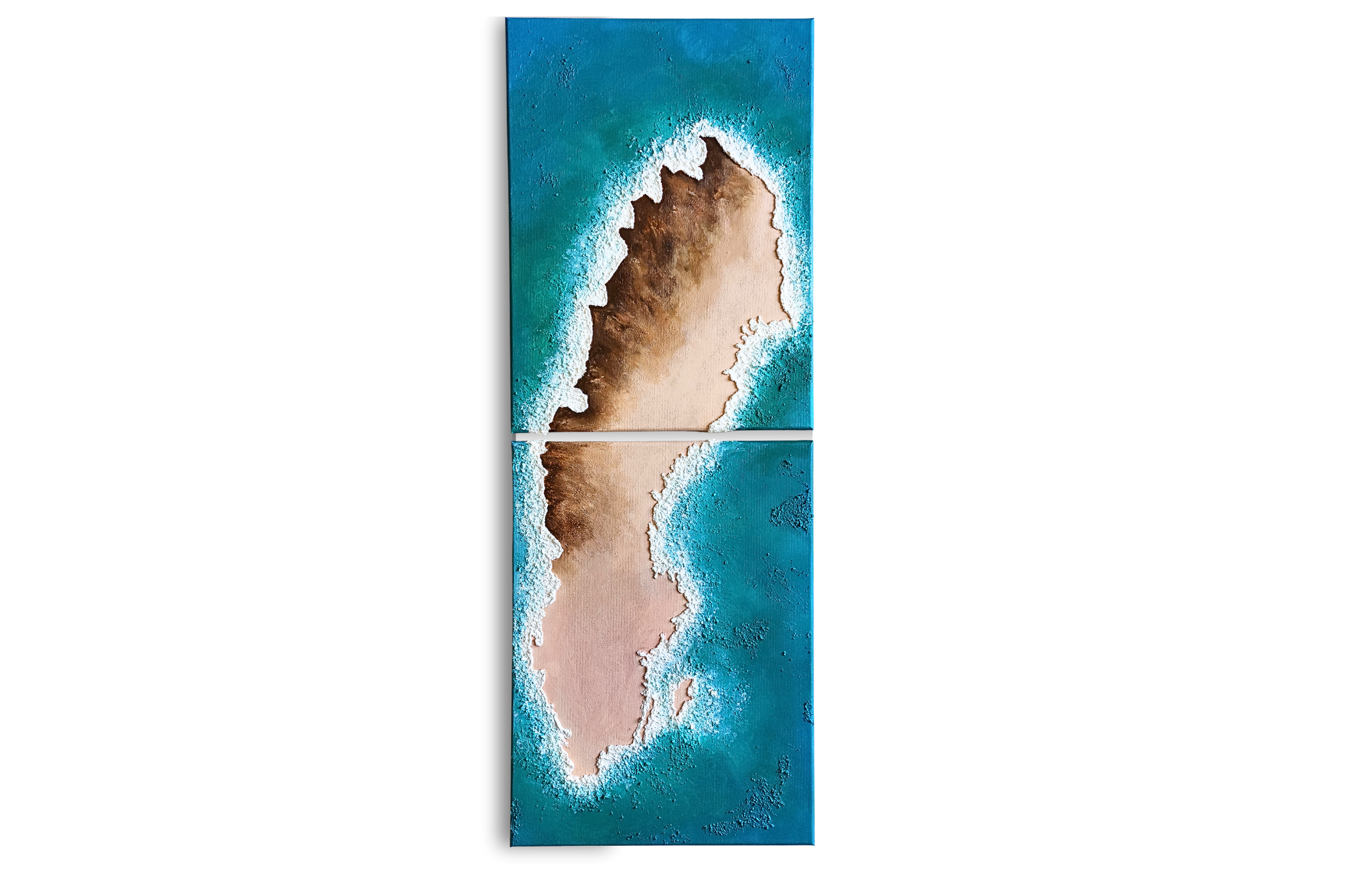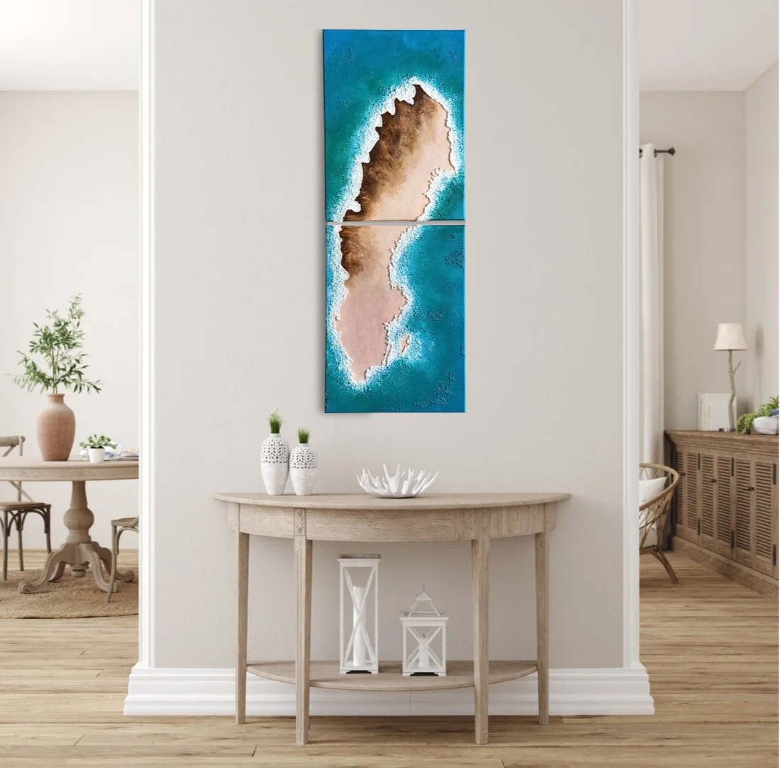 SWEDEN - De gespreksstarter voor je het vertellen van je vakantieverhalen. Een prachtig 2-delig schilderij met reliëf & natuurgetrouw hoogteverschil. De abstracte combinatie van het land met de azuurblauwe zee geven een tropisch warm en zonnig gevoel, als contrast tegen de herinneringen aan (kampeer)vakanties, landschappen en elanden. Acryl op canvas, twee doeken van 40x30cm. Totaal met tussenruimte: 82x30 cm.
