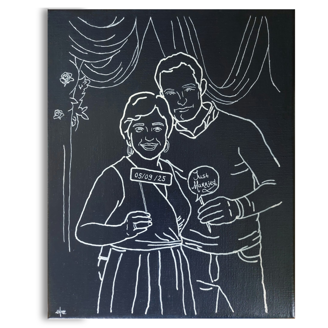 THE WEDDING - Opdracht om op basis van een foto een lijntekening te schilderen als cadeau, in Pruisisch blauw met zilver. Pruisisch blauw staat tevens bekend om, naast de luxe uitstraling en indien aangebracht in vele lagen, het licht te weerkaatsen. Bij zonnig weer oogt het helderder blauw, en uit de zon kan het bijna zwart zijn.