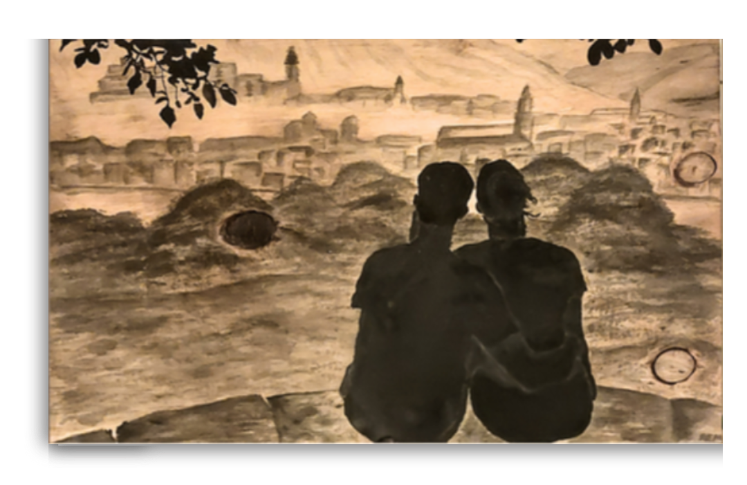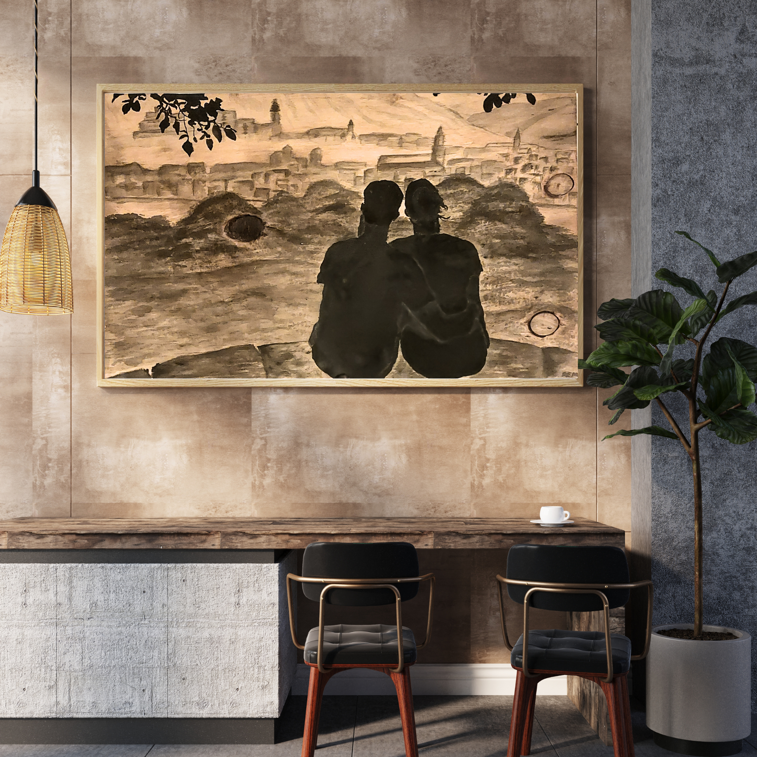 WOODEN SILHOUET - Dit silhouetschilderij van twee geliefden, geïnspireerd op hun vakantiefoto, is gemaakt op een rustiek houten paneel met knoesten. Met zorgvuldige aandacht voor schaduw en licht legt het kunstwerk de stille intimiteit en verbondenheid tussen de figuren vast, wat een gevoel van tijdloze romantiek oproept en een prachtige herinnering aan de muur creëert. Het acrylschilderij toont twee geliefden die zitten op een stenen muurtje, onder enkele takken en voor wat struiken, genietend van het uitzicht op een dorpje tussen de heuvels.